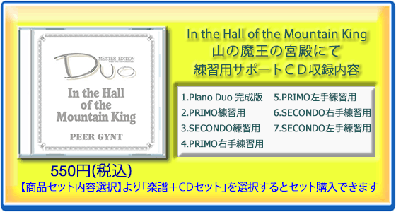 【曲名】山の魔王の宮殿にて(In the Hall of the Mountain King)|ペール・ギュント 【作曲者】グリーグ 【演奏スタイル】ピアノ4手連弾 【譜面 構成】ピース譜 (10ページ/92小節)