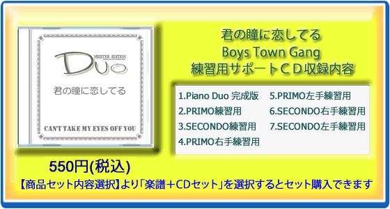 曲名:君の瞳に恋してるアーティスト:Boys Town Gang作曲者:CREWE BOB/GAUDIO BOB演奏スタイル:ピアノ4手連弾譜面構成:ピース譜 (14ページ/132小節)仕様:サイズ:縦309ミリ:横227ミリ(見開きA3サイズ大)/中紙:楽譜面 135K(一般的なピアノピースと同等/表紙:200K(楽譜を立てた時に折れ曲がらないよう適度に厚い)※この商品は、JASRAC(社団法人 日本音楽著作権協会)ならびに、権利者の出版利用許諾を得ている作品ですので、安心してお求め頂けます。